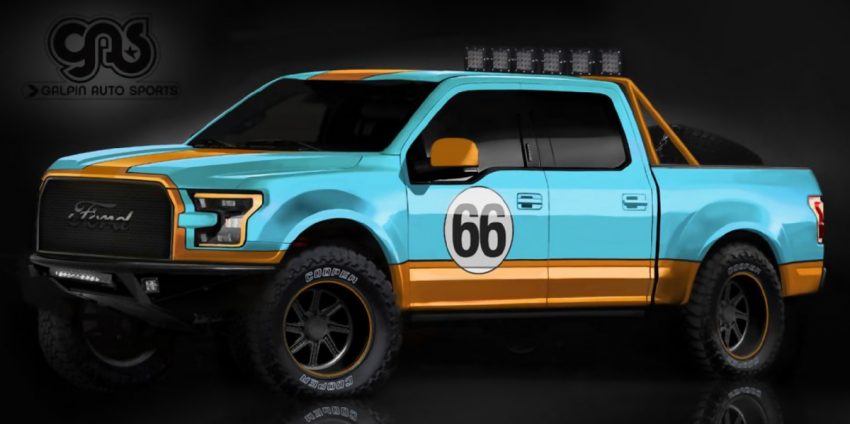 Enter the 2015 Ford F-150 SEMA concept by Galpin Auto Sports. Apart from the immediately recognizable Gulf livery and large, racing-inspired number 66 (the year that Ford’s GT40 first won the prestigious 24 Hours of Le Mans), Galpin’s F-150 features things like a different intercooler and performance exhaust system to augment the performance, and according to Automobile Magazine, the truck has been fitted with a Stage 3 suspension kit from Addictive Desert Designs, as well.