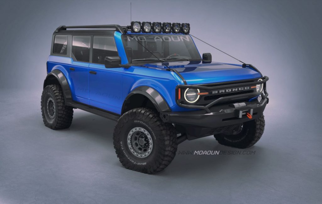The Bronco truck and four-door variant feature a host of rugged aftermarket goodies including beadlock wheels and BFGoodrich Mud-Terrain T/A tires, cool-looking yet minimalist brush guards up front, and aftermarket bumpers with integrated winches. The four-door also wears a row of extra LED lighting up top. Either way, they both look awesome, as does the somewhat stock-looking two-door Bronco rendering.