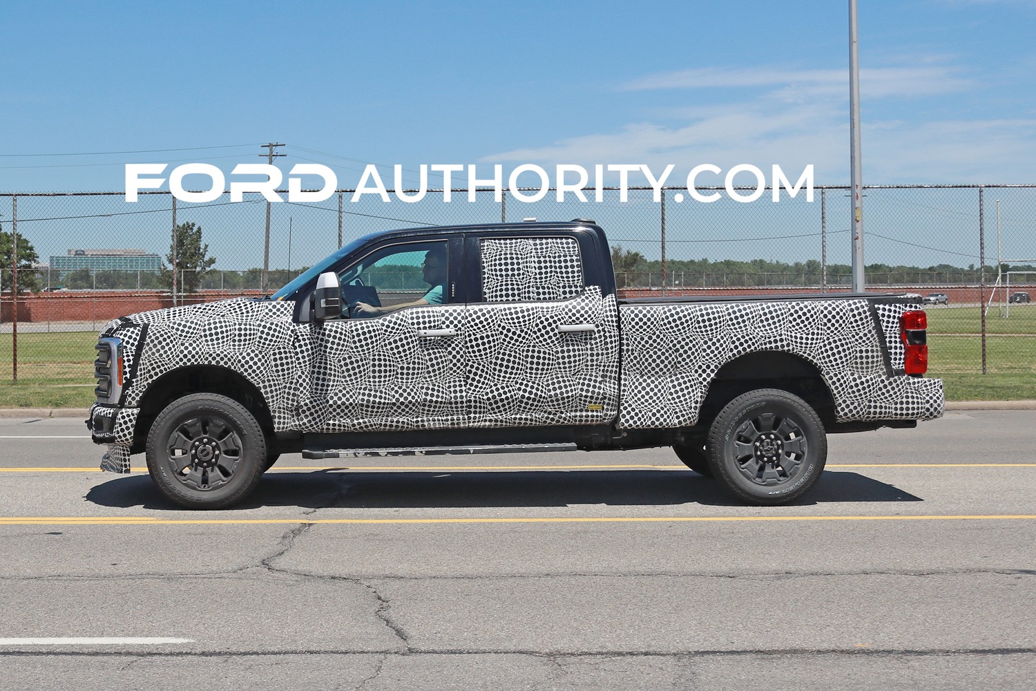 Moving down the side, we get a better look at this prototype's wheel design, but otherwise, not much has apparently changed in the center of the 2023 Super Duty, as the shape of the cab carries over from the current-gen model.