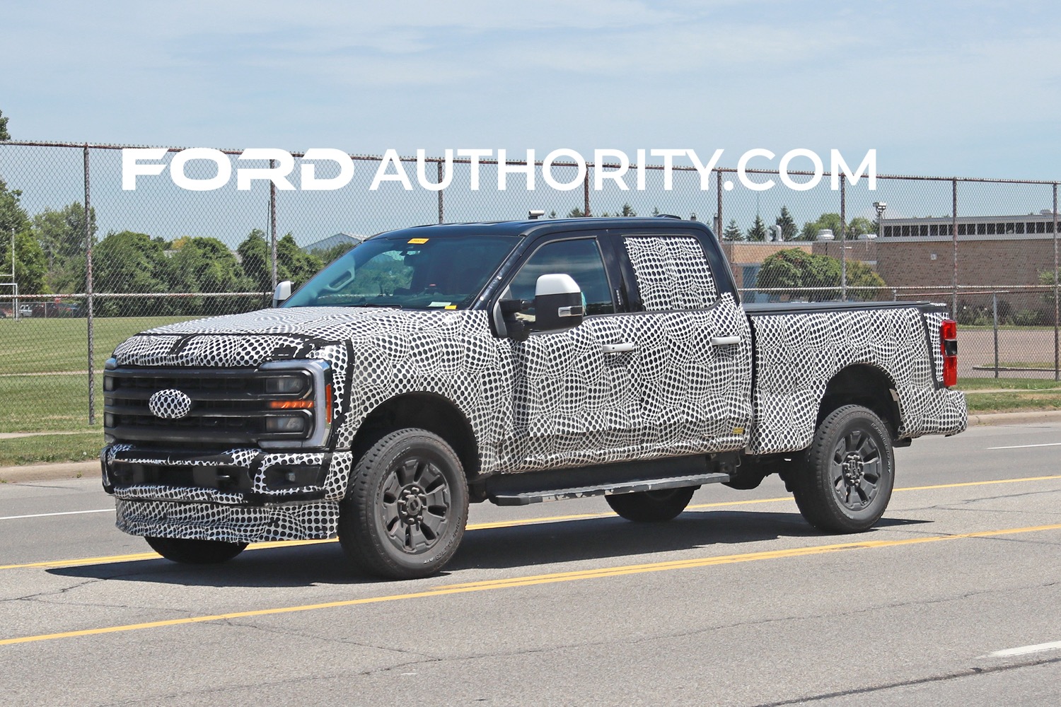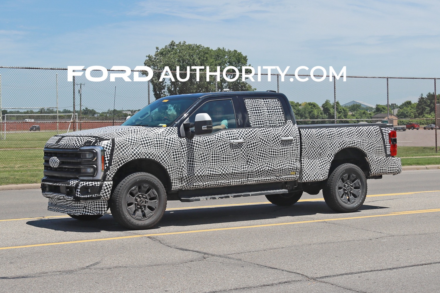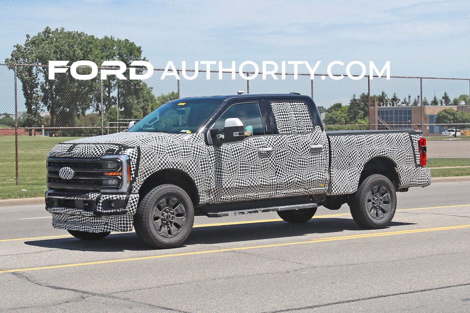 Ford Authority spies spotted a 2023 Ford Super Duty prototype for the very first time last October, previewing the pickup's upcoming refresh. Since then, those same spies have spotted a host of other 2023 Super Duty prototypes out driving around in various configurations, ranging from a single cab dually to a SuperCrew dually, a SuperCab with a standard bed, a Platinum-trimmed model with black wheels, and an F-450 towing a gooseneck trailer. Later on, we were treated to our first look at the refreshed Super Duty's interior, which was followed by a glimpse of the bare-bones XL cabin. Now, Ford Authority spies have spotted a 2023 Ford Super Duty SuperCrew prototype wearing considerably less camo than the previously-spied models, giving us a good look at the pickup's refreshed front and rear ends.