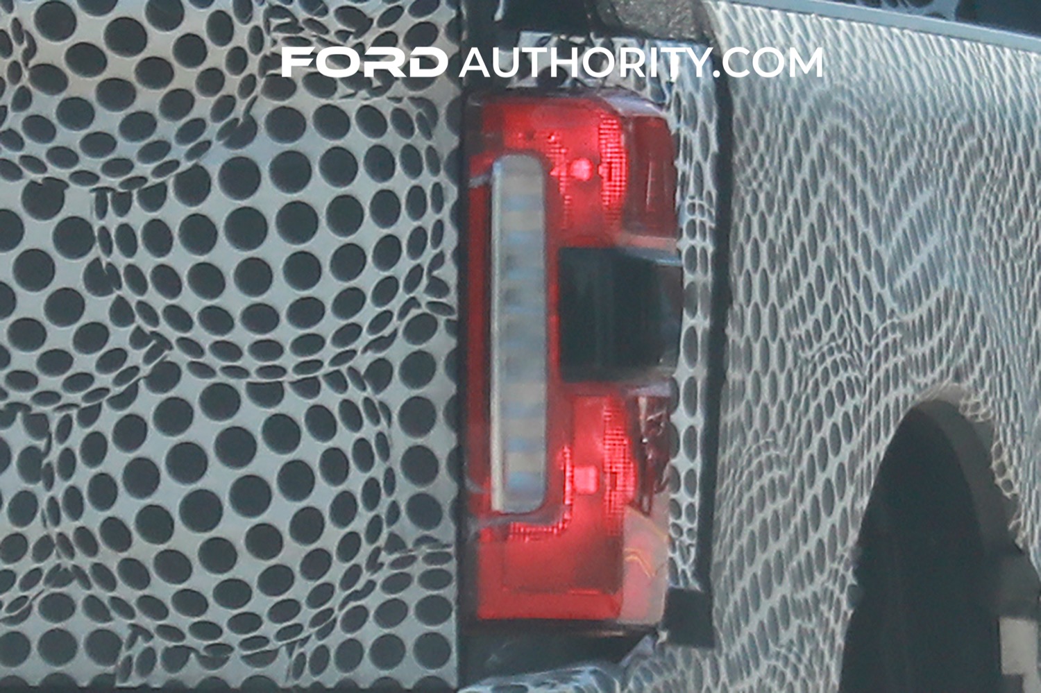 In the rear, we get our first look at the new taillight design present on the 2023 Ford Super Duty, which is a bit different than the current model. Red sections on the top and bottom are intersected by a black element, while the white reverse lamps are vertically-oriented and placed off-center towards the tailgate. Everything else, including the rear glass, is covered in checkered camo. It's unclear what trim level this particular prototype is, but it appears to be either a Lariat or perhaps an XLT with some sort of black appearance package.