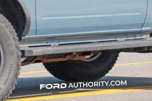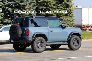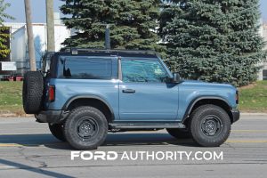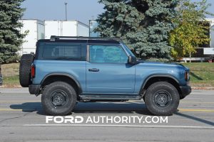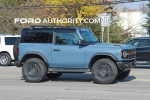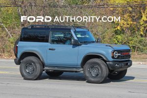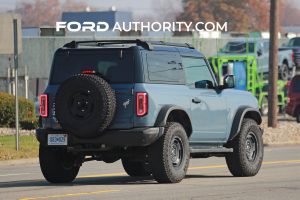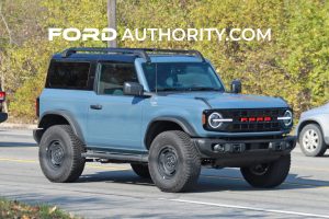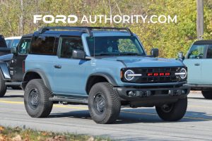 Back in October, Ford Authority spotted something very similar – a four-door Bronco wearing blacked-out trim, a Race Red “Ford” script grille, and various bits and pieces shared with the new Heritage models, such as squared-off fender flares and a unique wheel design. Now, we have this newly-spotted two-door to lull over, which is finished in the new-for-2023 hue dubbed Azure Gray.