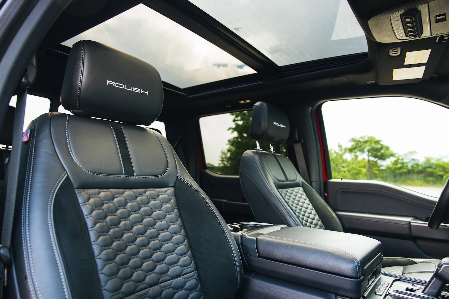 On the outside, the 2025 Roush RT6 F-150 features some typical upgrades from the third-party outfit in the form of a high-flow front grille with accent lighting, wide fender flares with integrated lighting, hood heat extractors, a front bumper cover, plus Roush badging and graphics. It rolls on a set of 20-inch satin black Roush wheels wrapped with 35-inch General Grabber A/TX tires, while a set of laser-etched Roush exhaust tips resides out back.