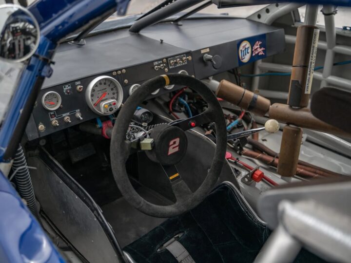 Inside, one will find an aluminum ButlerBuilt fixed seat, head restraints, a Simpson Racing harness, a Hurst shifter, a padded roll cage, a window net, a MOMO three-spoke steering wheel, AutoMeter Pro-Comp gauges, and a fire-suppression system. Power comes from a Penske Racing-built 358 cubic-inch V8, mated to a four-speed manual transmission, and the car even comes with a collection of Miller Lite Racing and Rusty Wallace memorabilia.