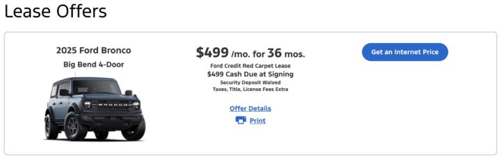 Discount and incentive offers vary by region. Below are available featured offers in four large U.S. markets for the 2025 Ford Bronco in September 2025, including any national ones: