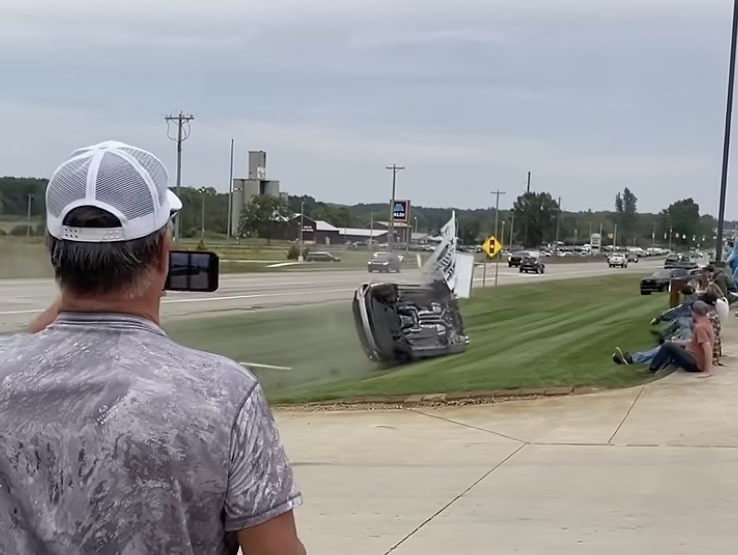 In a short clip posted to YouTube, we get a good view of this incident, which began as the Ford Mustang driver was leaving a car show in Hillsdale, Michigan. As is usually the case, there’s a crowd gathered by the roadway watching vehicles depart, which generally only encourages drivers to do silly things to show off. In this case, that’s exactly what happens, as the Mustang driver gives it some gas, which breaks the rear tires loose rather quickly.