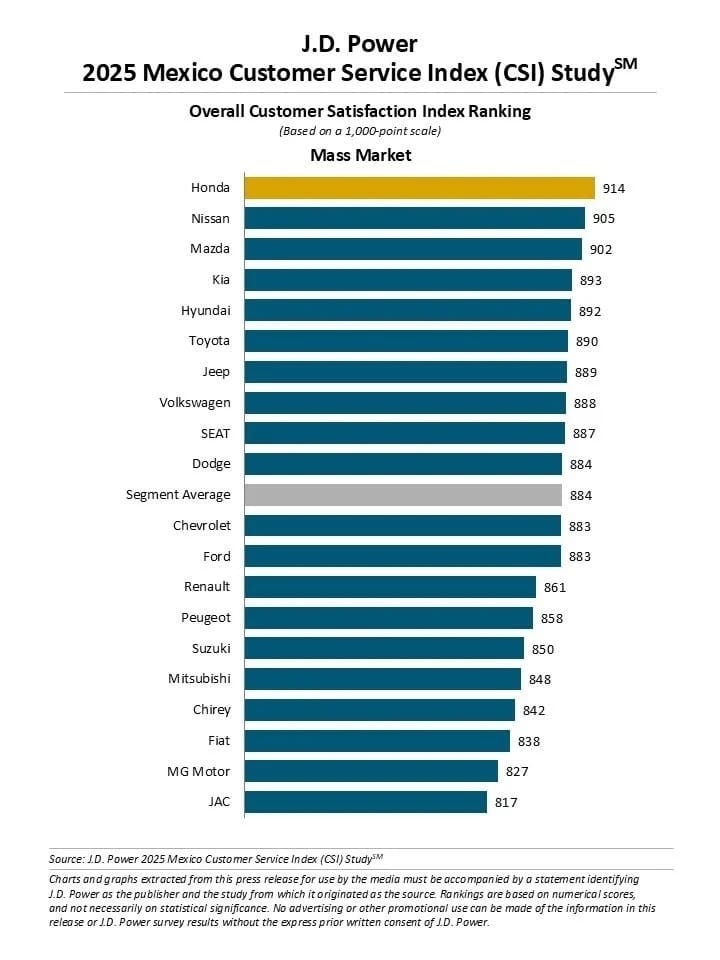J.D. Power’s Mexico CSI Study is analyzes the service experience among owners of one- to three-year-old vehicles, and evaluates customer satisfaction with their authorized dealer using five key measures – service quality; service facility; service initiation; service advisor; and vehicle pickup. This year’s study is based on 6,683 evaluations for the 2022, 2023, and 2024 model years, and found that emerging Chinese brands, specifically, are struggling to catch up with established ones.
