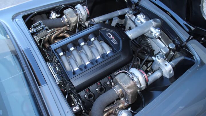 Rolling on a brand new chassis from Scott’s Hot Rods, power for this first-generation Ford Thunderbird comes from a built 5.0L V8 Coyote engine with forged pistons, twin turbos, and various other mods that aren’t listed here, for some reason.