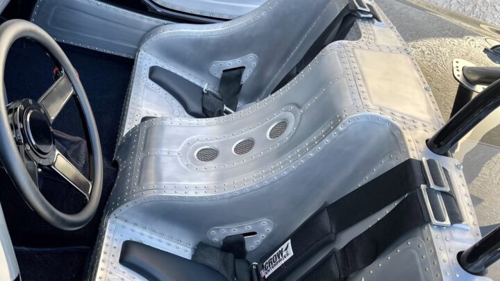Inside, one will find a very much custom interior as well, fitted with metal seating sporting exposed rivets, racing harnesses, and minimal padding – not something one would want to spend hours cruising around in, we imagine. It looks cool at least, and is surrounded by a roll bar for the driver, updated instrumentation, an aftermarket steering wheel, and lots of smooth, painted surfaces.