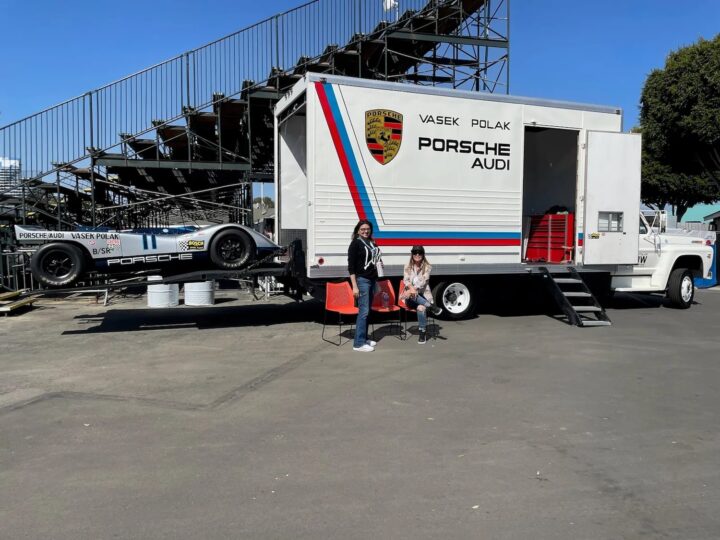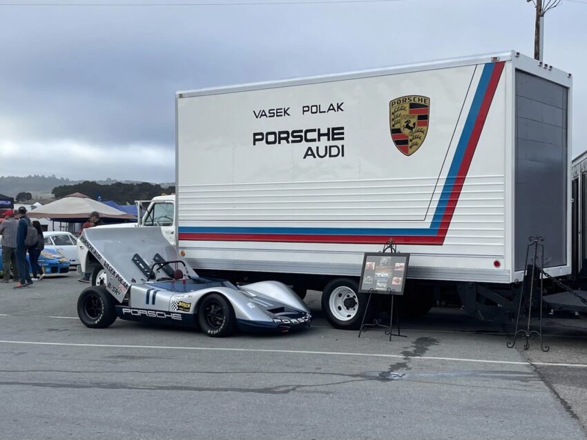 As for the 1970 Ford F-600 that comes with the Porsche racer, it has some ties to that model as well - it was used as a race support vehicle by Polak in the 1970s, and was later refurbished to its current state. It's finished in white with hand-painted BMW lettering and a large cargo box out back sporting Vasek Polak graphics. A hydraulic liftgate and ramps helps the loading and unloading process, too.