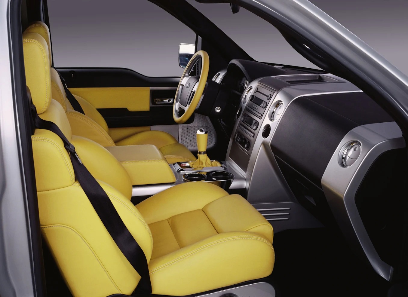 Inside, the Ford SVT Lightning concept built on the Lariat trim's cockpit, furnished in Mustard Yellow leather with Ebony carpet and door trim. These colors complemented the pickup's Liquid Silver Metallic exterior, making it an eye catching one-of-one.