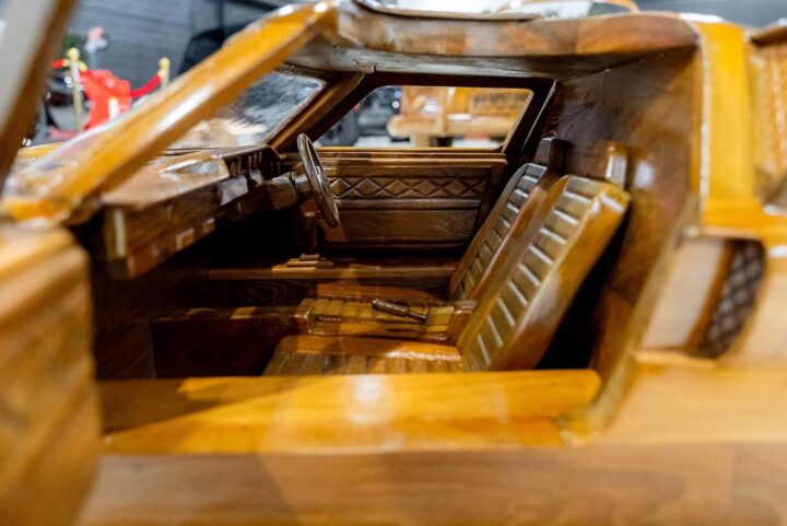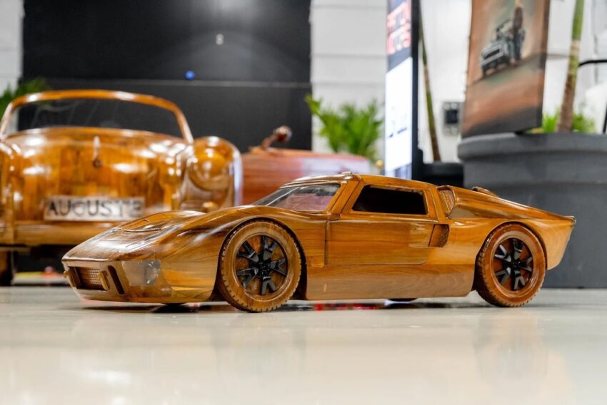 The GT40 rolls on a set of wooden wheels and tires, the latter of which even feature a tread pattern cut out in them. The interior is quite realistic as well, sporting two bucket seats with carved stripes, a dashboard, a center console, a steering wheel, instrumentation, a door-sill-mounted shifter, a handbrake lever, and patterned door panels.