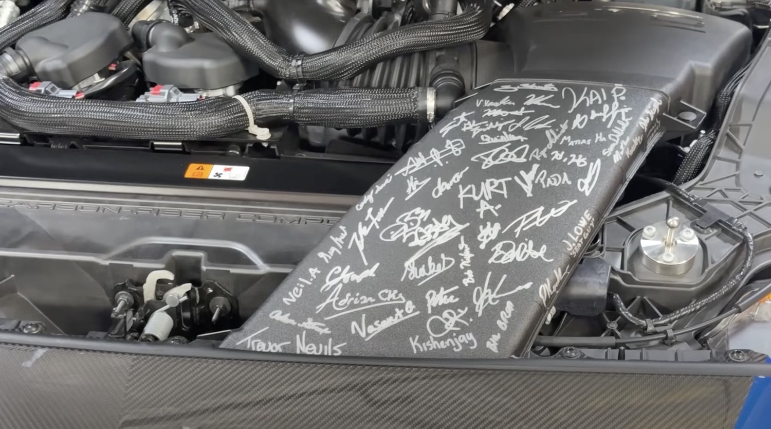 In a recent appearance on the Spike's Car Radio podcast, Leno revealed that the entire Ford Mustang GTD team signed an air intake in the engine bay of his car, which is a nifty touch. He even showed off those signatures in this video, and there are quite a few of them - though he notes that Multimatic team that transforms regular body-in-white Mustangs into GTDs is a pretty small outfit, by comparison to something like The Blue Oval, at least.