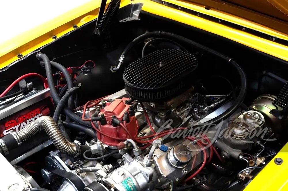 In terms of what lies under the hood, that’s a freshly built 302 cubic-inch Ford V8 equipped with a FiTech electronic fuel injection system, a serpentine accessory drive, an aluminum radiator with an electric fan, headers, and a dual-exhaust system. It sends power to the rear wheels via a three-speed automatic transmission and a 9-inch rear end.