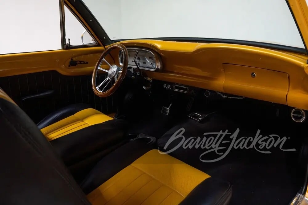 Rolling on a set of 15-inch five-spoke American Racing wheels wrapped with new radial tires, this restomodded Ford Ranchero also features a totally custom interior, too. Inside the cabin, one will find two-tone yellow and black leather bucket seats, plus Vintage Air climate control, Dakota Digital gauges, a tilt column with a wood-rimmed steering wheel, billet door handles and window cranks, plus a center console.