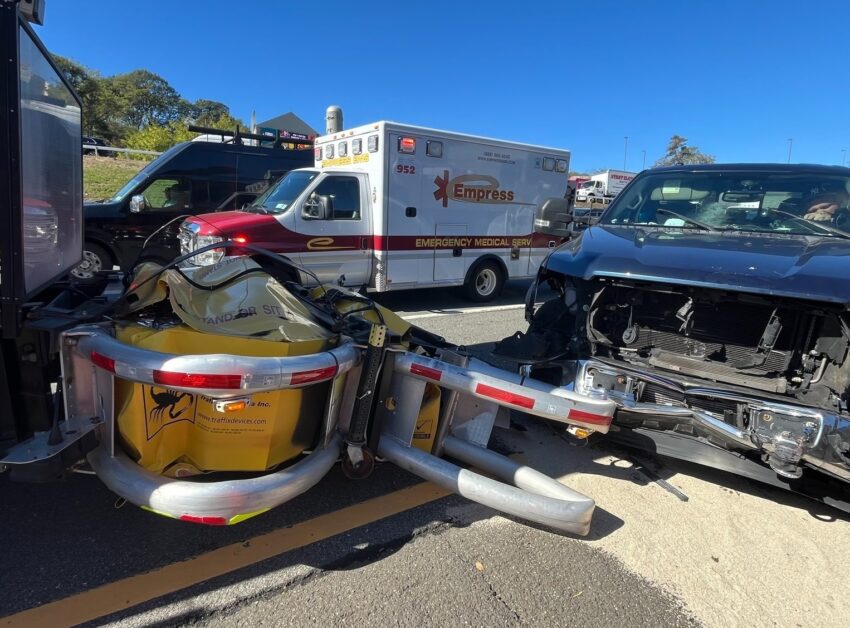 That agency is the New York State Thruway Authority, which recently posted some photos on Facebook, along with some alarming news regarding an incident that occurred not too long ago. Last week, one of the NYS Thruway Authority's attenuator trucks was out protecting a crew working on the side of I-87 in Yonkers, and thankfully, that rig did its job in protecting those folks, because the Ford F-150 driver clearly wasn't paying attention.