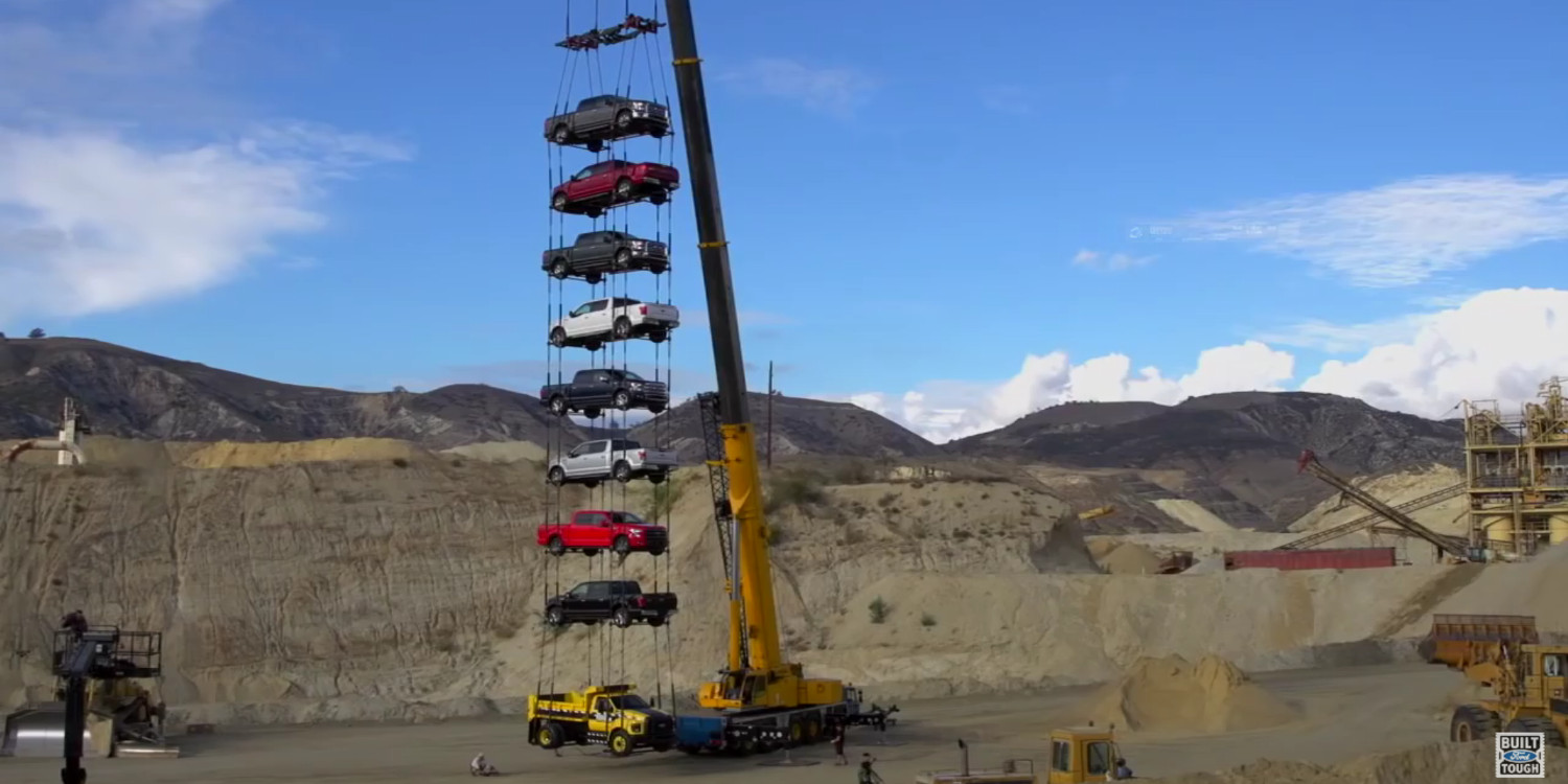 Now, a follow-up video takes us behind the scenes, showing us how the 2017 Ford Super Duty frame was loaded up with eight 4,700-pound F-150 models, plus a 13,660-pound F-750 Tonka dump truck and nearly 9,000 pounds of rigging equipment and lived to tell the tale. We don’t see any evidence of trickery here; a rectangular cable spreader distributed vertical load from the crane to two horizontal bars located about where the axles would be. The downward load from the weight itself is applied directly to the frame via eight u-shaped brackets – two on either side of each of the four axle points.