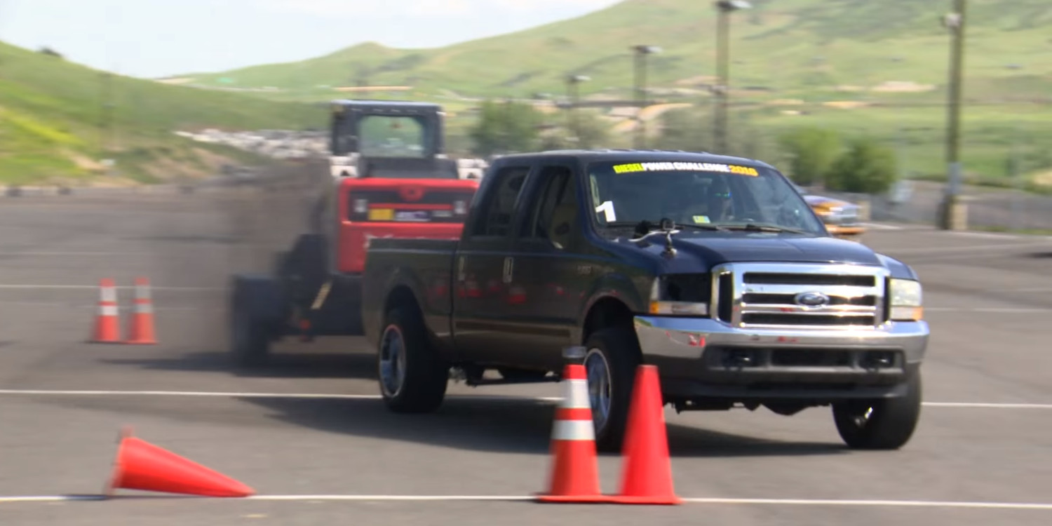 Skip ahead to 2:42 in the video above to see the first Ford Super Duty of the day tackle the 10,000-Pound Trailer-Tow Obstacle Course. More smoke-belching Ford Super Duty diesel trucks take to the track later, starting at 4:46, 6:37, and 12:45.