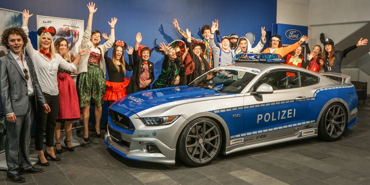 Rosenmontag is the highlight of the German Karneval, held every year on the Monday preceding Ash Wednesday. The Mustang police car that led the parade was based on the “Tune It! Safe!” demo car pictured above, which was commissioned by Germany’s Verband der Automobil Tuner to promote safe car-modifying practices.