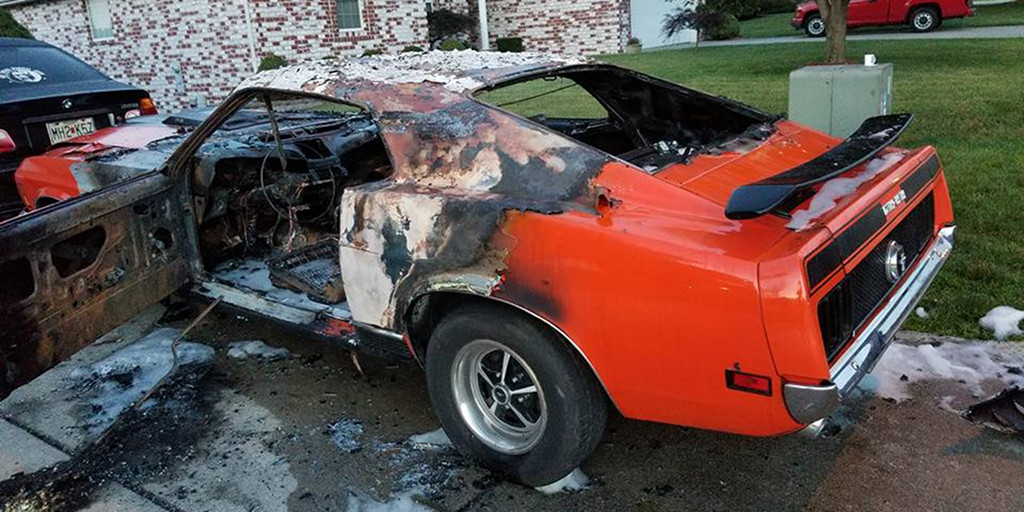 The car was reportedly started on fire by someone opening a small vent window and tossing lit fireworks inside. It's unknown as of now whether the 1970 Ford Mustang Mach 1 can be restored, or its 351-cubic-inch V8 at least salvaged. It's not even certain how much of the car's $30,000 to $40,000 estimated value will be covered by insurance.