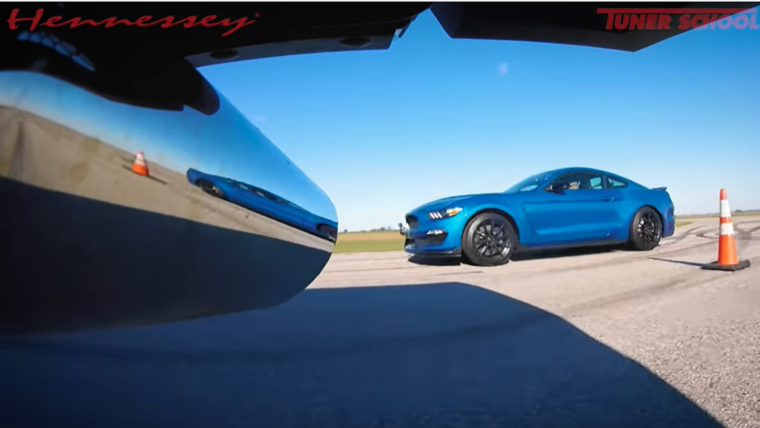 The Shelby GT350 has not one little bit of a chance in either of the drag races against the Venom 775. It’s impressive to see a lifted truck on massive off-road wheels and tires launch as hard as the Venom 775 does. We will say that the driver of the Shelby appears to be having a hard time hitting shifts and launching the car.
