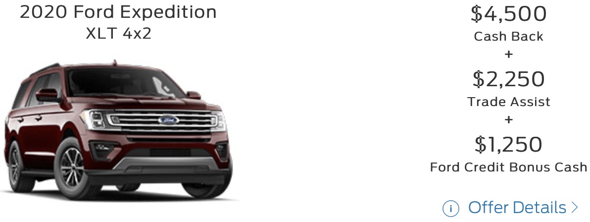 The cashback amounts can vary by market, though the alternative incentives appear to be be less generous than the headlining offer. Notably, we did not observe any special-financing offers for the Expedition this month.