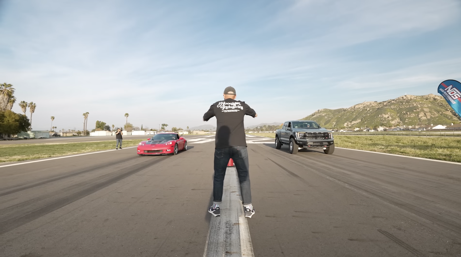 Before that particular race, however, the Corvette was set to take on a 2018 Ford F-150 Raptor, though this is no stock pickup. Rather, the hauler is packing a punched-out, twin-turbocharged Ford 5.0L V8 Coyote underhood making a whopping 1,017 horsepower. It seems like a pretty good match for the C6 and its 550 rear-wheel horsepower coming from a naturally-aspirated 6.2L V8, since the fiberglass sports car weighs nearly half as much as the off-road pickup.