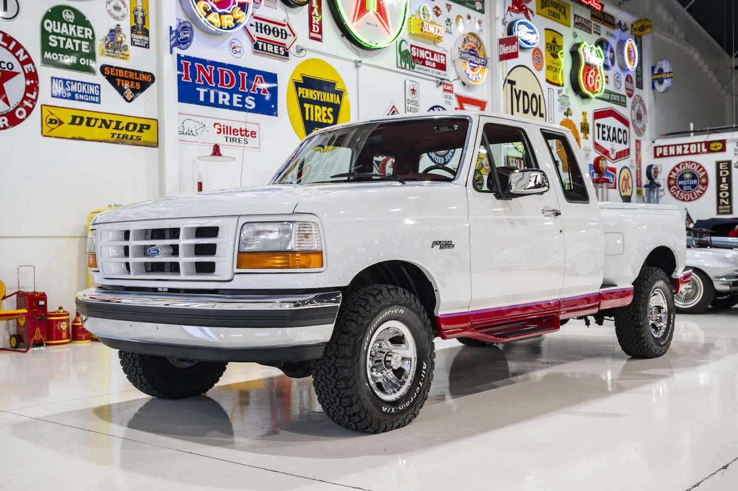 This incredibly low-mile 1992 Ford F-150 Flareside was sold new at Charlie Ruth Ford of Henryetta, Oklahoma, and was just acquired by the selling dealer this year, but it’s unclear what happened that resulted in it not really being used over the past few decades. Regardless, it remains in showroom-like condition with perfect Oxford White paint and Bright Red lower bodywork, the beloved Flareside treatment, and 15-inch chrome-finished steel wheels, which have been wrapped with a new set of 31-inch BFGoodrich All-Terrain tires.