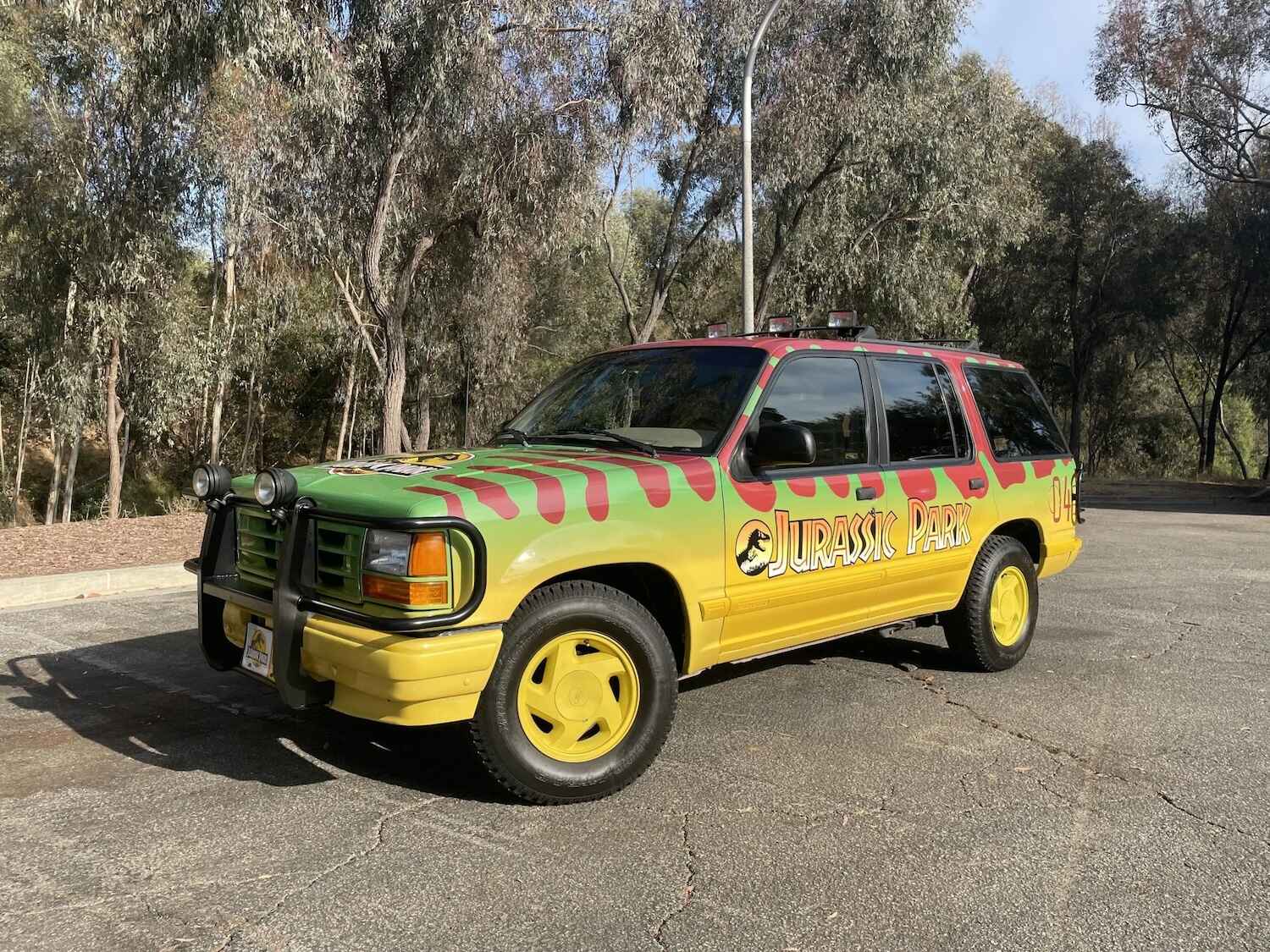 This 1992 Ford Explorer is yet another Jurassic Park tribute to emerge for sale, this time, via Bring a Trailer. It was originally finished in Medium Mocha Metallic, but has since been treated to a red, green, and yellow Jurassic Park-style livery, yellow Plasti-Dip coated wheels and body side moldings, a front brush guard, a roof rack, taillight guards, and auxiliary lighting – making it look just like the famous movie star.