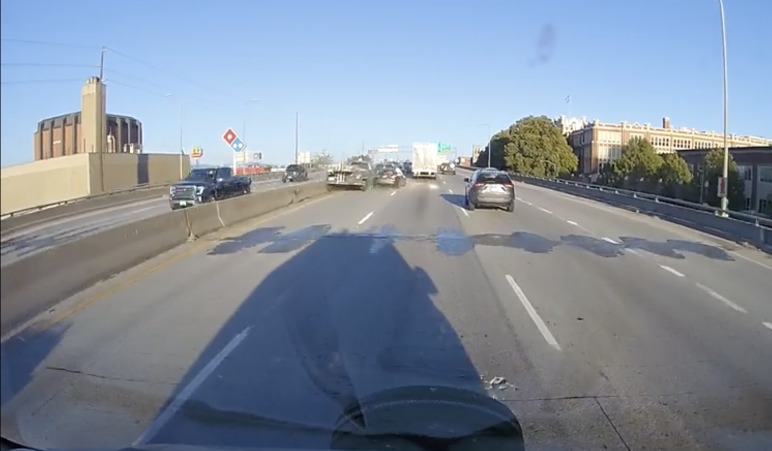 The Super Duty driver seems to only notice what's happening when they get very close to the car that's stopped in the fast lane ahead of them, but there's simply nowhere to go at that point. The driver tries to veer left to avoid a collision, but the concrete median in the center lane prevents that from happening, and the truck winds up hitting both it and the car in front of it - not to mention another truck.