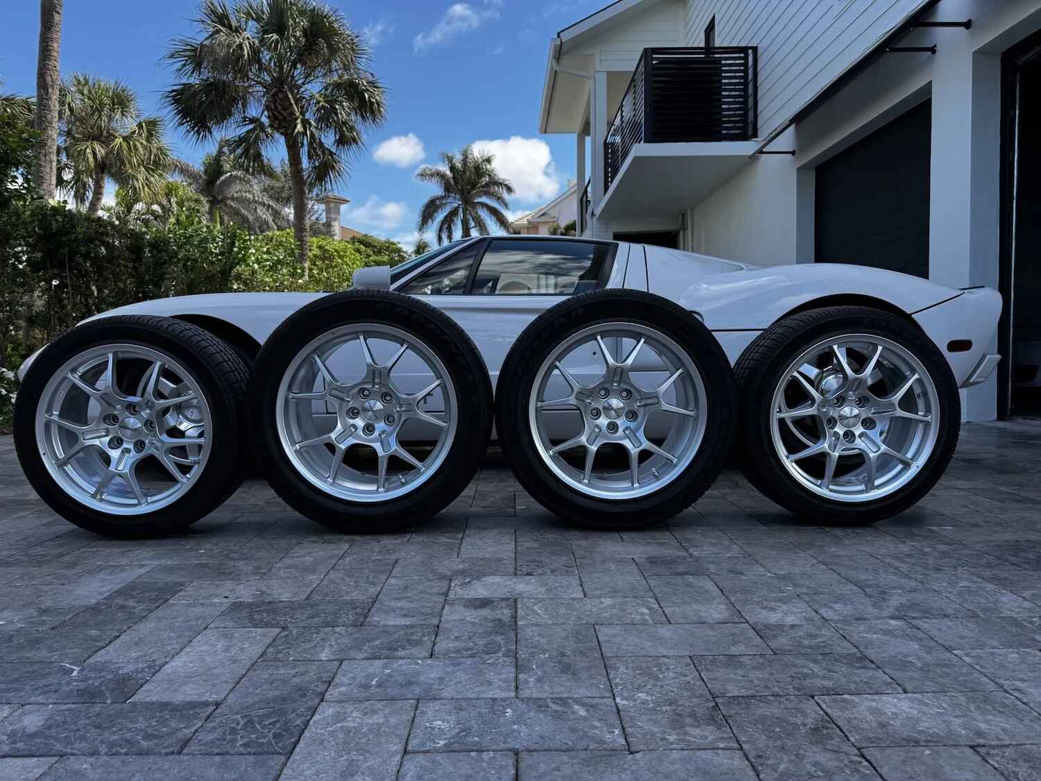 These five-lug split-spoke BBS wheels measure 18×9 inches up front and 19×11.5 inches in the rear, and they feature single-piece forged alloy construction. The wheels are painted silver with a split-spoke design, a Ford GT-script center cap, and BBS-logo valve stem covers, and are currently wrapped with an older set of Goodyear Eagle F1 Supercar tires that the seller notes should probably be replaced, due to age.