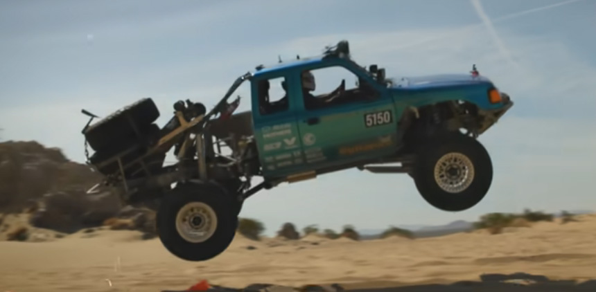 After a few more tries, they have something a bit more impressive to boast about, launching the Ranger into the sky in the desert and bringing it down on the right rear tire. The leaf spring on that side bowed under the pressure, but that doesn’t stop them from having one more go at it, leaping “Free Willy” style one more time.