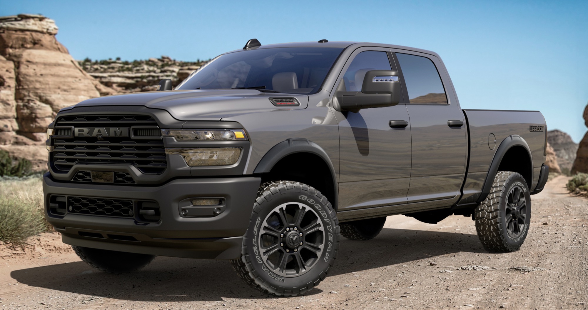 As for the 2026 Ram 2500 Warlock, it’s available exclusively in Crew Cab, four-wheel drive, short bed guise, and gets a black grille surround, flares, and bumpers, plus a Warlock bedside decal, 20-inch diamond cut wheels with 34-inch Goodyear Duratrac all-terrain tires, power convex trailer tow mirrors, and exterior color choices consisting of Diamond Black, Bright White, Granite Crystal, Silver Zynith, Forged Blue, Flame Red, Ceramic Gray, and Molten Red.