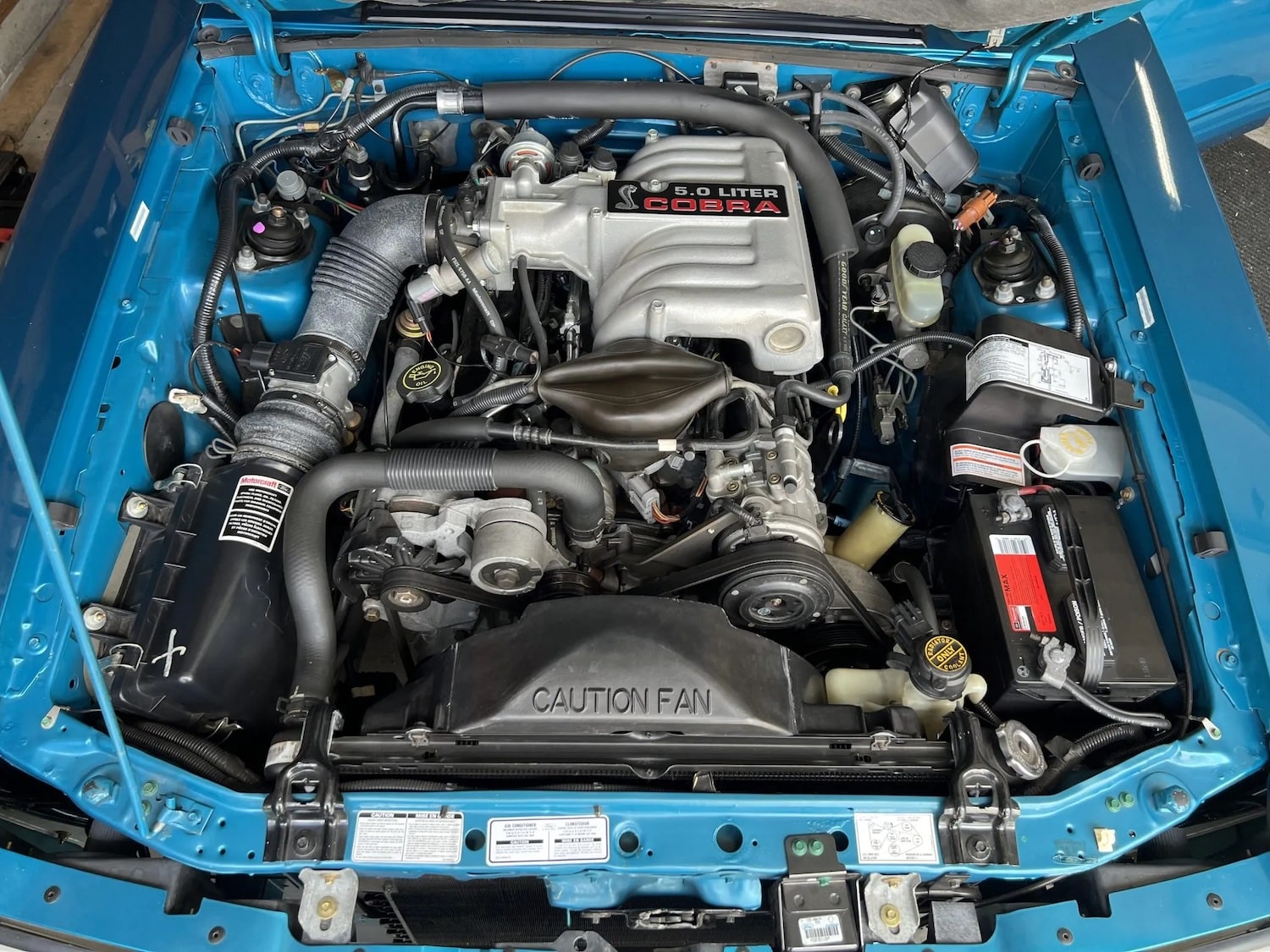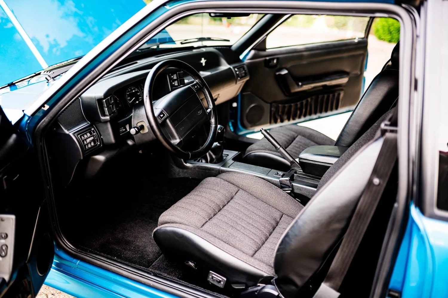 Power for this pony car comes from the naturally-aspirated Ford 5.0L V8, in this guise factory-rated to produce 235 horsepower and 280 pound-feet of torque, thanks to upgrades including a Cobra-specific upper intake manifold and camshaft as well as a 65mm throttle body, GT40 cast-iron cylinder heads, and aluminum roller rockers. It’s mated to the BorgWarner T5 five-speed manual gearbox, plus a Traction-Lok rear axle with 3.08 gears, making for an enticing – and pricey – package, as it sits today.