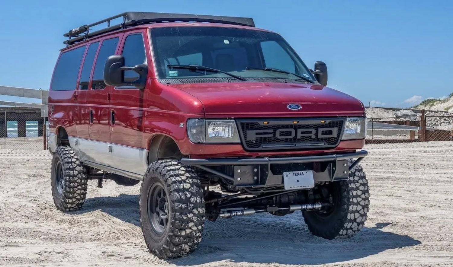 This 2000 Ford E-350 is currently up for auction at Bring a Trailer with a bevy of upgrades, starting on the outside with a Raptor-style front grille, a tubular front bumper, towing mirrors, a roof rack and ladder, black wheel arch extensions, clear taillights, and a receiver hitch, along with black Method wheels wrapped with Yokohama Geolander X-MT tires. Underneath, one will find a Sky Fab leaf spring inversion kit, Fox 2.0 Performance series shocks, MG Metal Works radius arms, and axle and track bar brackets, providing a bit of a lift.