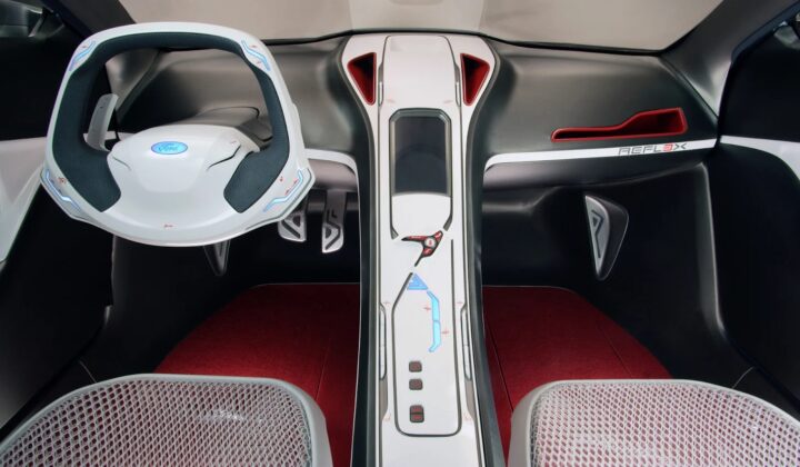Outside, the 2006 Ford Reflex boasted an expression dominated by the iconic three-bar Ford grille. Reverse butterfly doors made ingress and egress as easy as possible, while its low-voltage circuitry was not hidden, but shown off on its glass roof as a functional design element. Its 20-inch wheels were made of polished alloy, and its specially designed tires helped it achieve that 65 mpg efficiency rating.