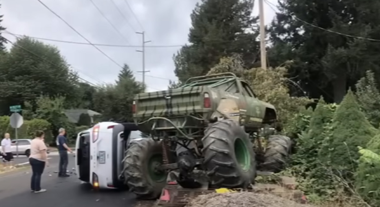 According to a report from Fox 12 Oregon, the monster truck, named "Pure Insanity," is owned by Derek "Barney" Barnum for almost 20 years. It began life as a 1973 Dodge pickup, and Barnum personally customized the truck into what it is today. It stars in quite a few shows every year, but it's going to need some work after a Ford Escape slammed into it while it was parked.