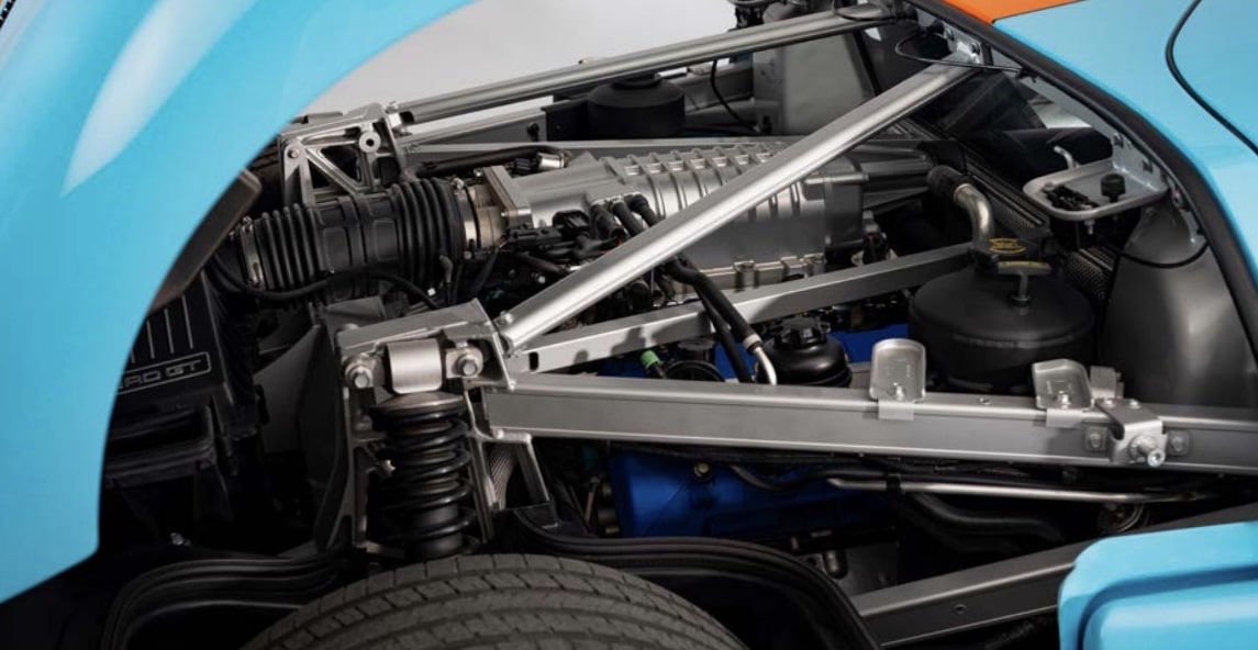 Power for this 2006 Ford GT comes from the supercharged 5.4L V8, which was factory rated to produce 550 horsepower and 500 pound-feet of torque, which flows to the rear wheels via a six-speed manual transmission.