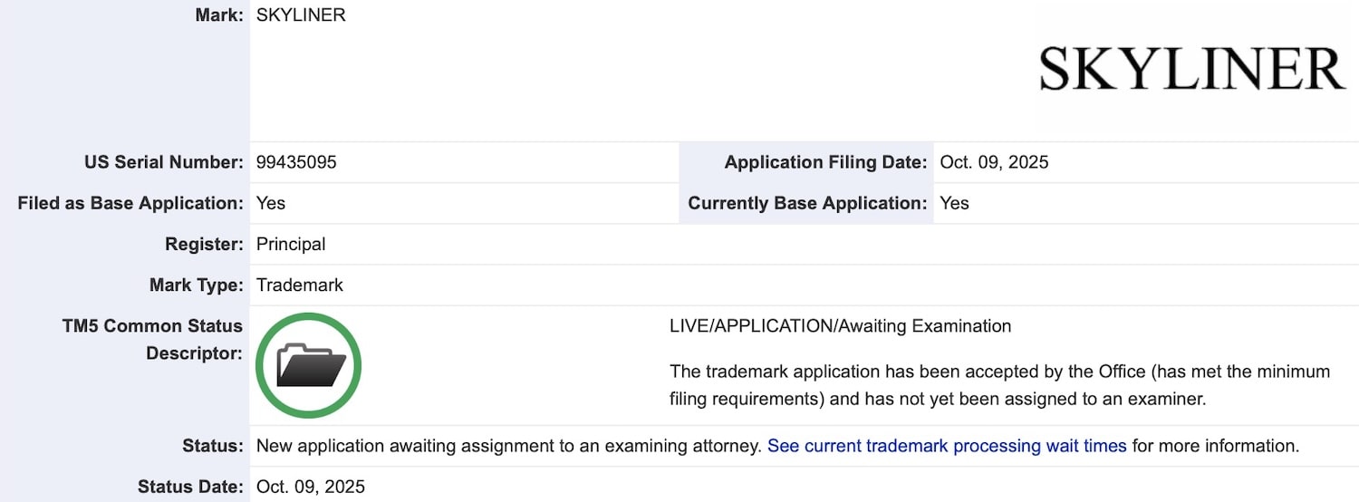 Filed on October 9th, 2025, and assigned serial number 99435095, the application contains the goods and services description of “exterior insignia badges for motor vehicles,” “vehicle floor mats,” and “toy replicas of vehicles and collector replicas of vehicles.”